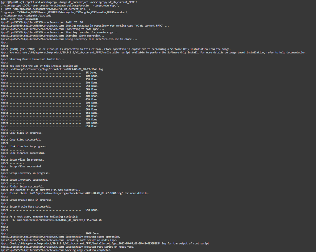 rhpctl add workingcopy -image db_current_oci -workingcopy WC_db_current_FPPC -storagetype LOCAL -user oracle -oraclebase /u01/app/oracle -targetnode fppc -path /u01/app/oracle/product/19.0.0.0/WC_db_current_FPPC -groups OSDBA=dba,OSOPER=oper,OSBACKUP=backupdba,OSDG=dgdba,OSKM=kmdba,OSRAC=racdba -sudouser opc -sudopath /bin/sudo