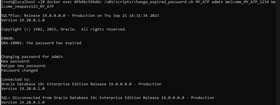 docker exec 0fb4bc594d6c /u01/scripts/change_expired_password.sh MY_ATP admin Welcome_MY_ATP_1234 Welcome_newpass123_MY_ATP