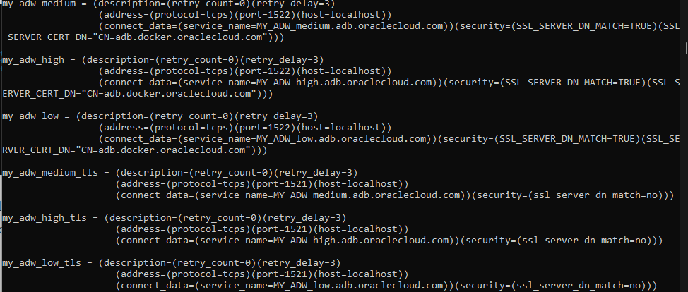If we take a look to the tnsnames.ora file we can see that there are some entries define that we can use to connect to our databases in our container: