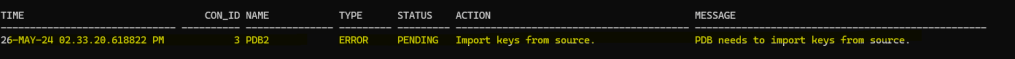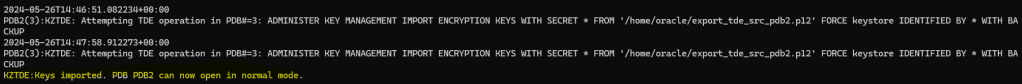 We have successfully imported the encryption key for our PDB in the target CDB, if we take a look to the alert we can see a nice message