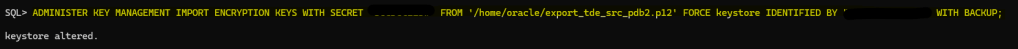 ADMINISTER KEY MANAGEMENT IMPORT ENCRYPTION KEYS WITH SECRET "***" FROM '/home/oracle/export_tde_src_pdb2.p12' FORCE keystore IDENTIFIED BY "***" WITH BACKUP;