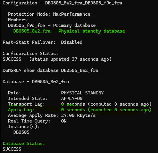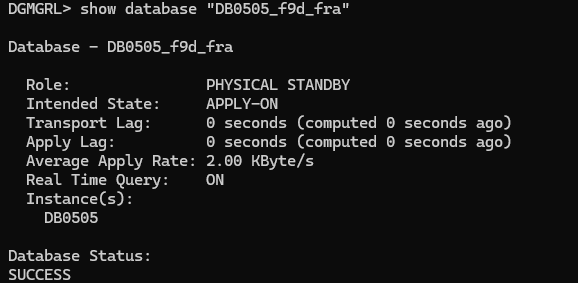 Configuration looks good, however, take into consideration that we won’t be able to open the PDBNEW as we haven’t recovered it yet. Deferred state is only helping us to continue protecting the other PDBs in the DR configuration, and we can still perform switchover operations.