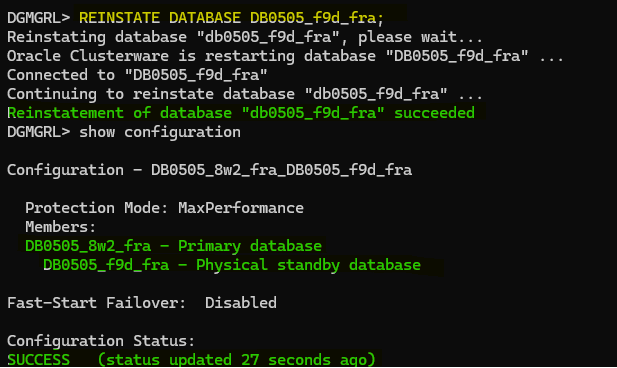 So, we haven’t found any issues to perform switchover and failover operations. I will reinstate the other database so I will have the configuration as it was originally so I can move forward with the last part!