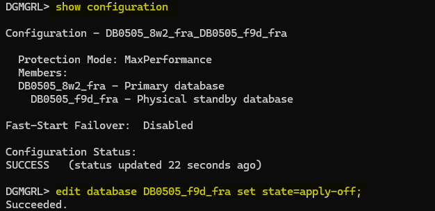 Let’s start redo apply for the physical standby database in the DG Broker:
