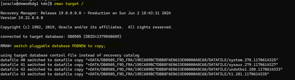 Now, let’s connect to RMAN on the standby database and switch the pluggable database files to the ones just restored: