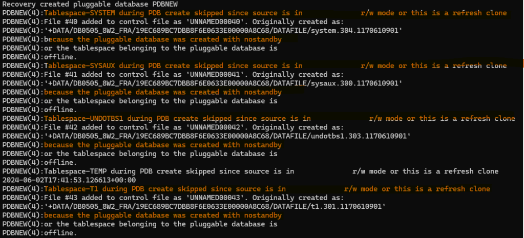 In summary, we have created the definition of our new PDB in the standby site, and recovery has been disabled for that PDB as datafiles do not exist, at least yet. This is giving us a benefit to maintain the rest of the PDB protected by our Data Guard and the possibility to sync the new PDB later if we want to protect it as well.