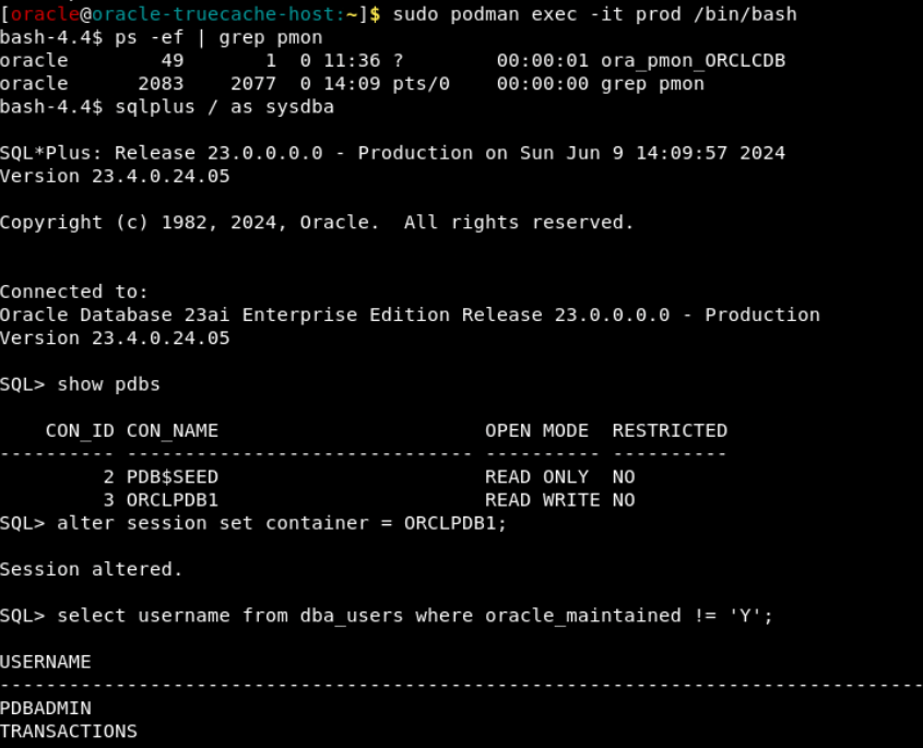 Let’s connect to the True Cache database and check that, and see also if the TRANSACTIONS schema is there.
