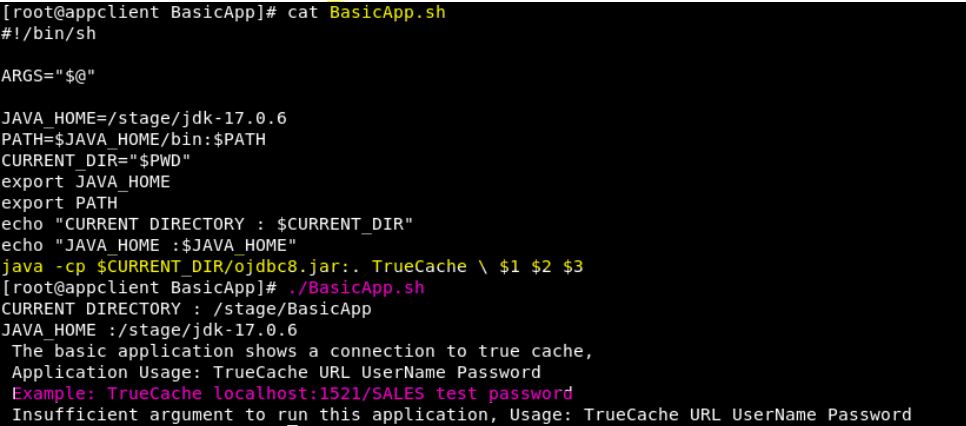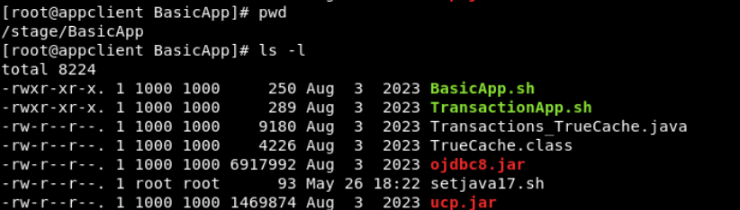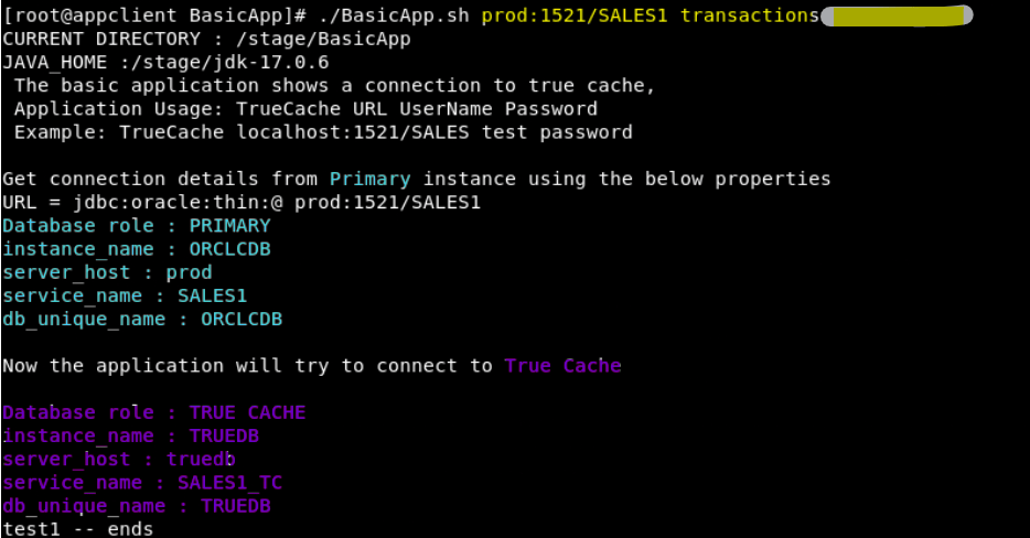 So, in the directory /stage/clientapp run the TransactionApp.sh. You don’t need to provide the host:port/service_name username and password in this case as they are already in the script. If that is not the case, you can add them, but make sure to add the flag as well. The flag is to tell the app to connect first to the primary (flag = false) and then to the True Cache database (flag = true).