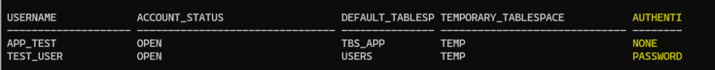 SELECT username, account_status, default_tablespace, temporary_tablespace, authentication_type FROM dba_users WHERE username in ('APP_TEST','TEST_USER');