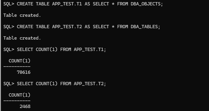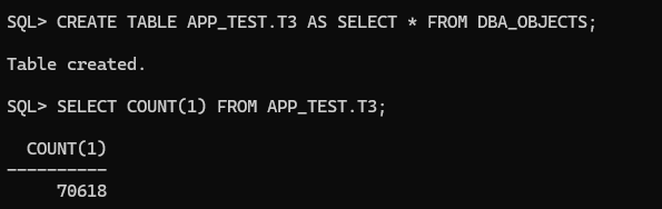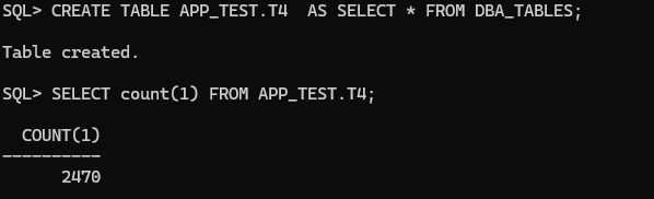 CREATE TABLE APP_TEST.T2 AS SELECT * FROM DBA_TABLES;