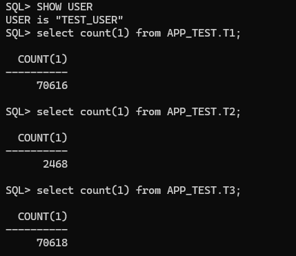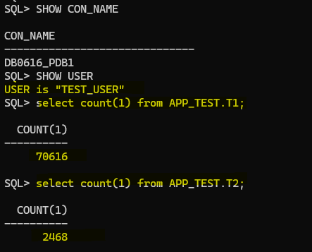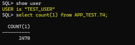 Now, let’s connect with the TEST_USER and see if we can access the T1 and T2 table from APP_TEST schema: