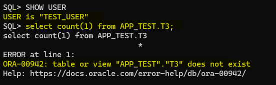 So, the new table is there but TEST_USER does not have the SELECT privilege yet, and this will happen if more changes are introduced in the APP_TEST schema.