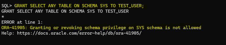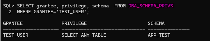 PoLP), if for some reasons we want to give permission in a granular way example: GRANT SELECT ANY TABLE ON SCHEMA APP_TEST TO TEST_USER EXCLUDING CARD_DETAILS that’s not possible nowadays, in that case we should move forward with the old approach and grant theSELECTon tables we just want theTEST_USERtoSELECTfrom theAPP_TESTschema, hopefully, that kind of feature will be introduced later on, who knows! - The schema privileges can be granted to, and revoked from, users and roles.