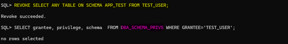 REVOKE SELECT ANY TABLE ON SCHEMA APP_TEST FROM TEST_USER;