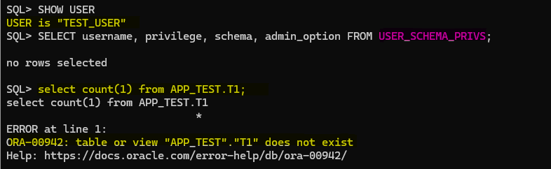 If we connect as TEST_USER and check again we are not able to SELECT the tables from APP_TEST schema: