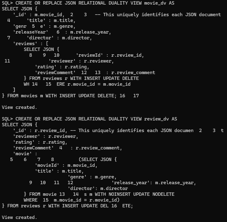 Now let’s create the JSON duality views, you will see some explanation in the next part.