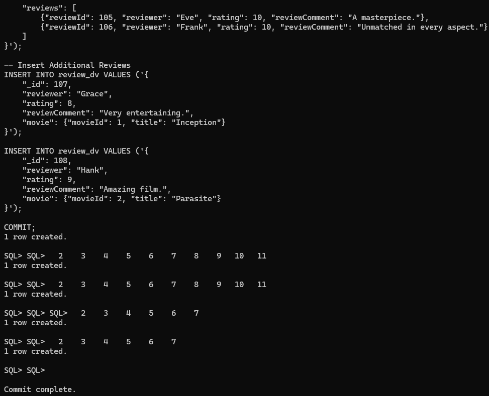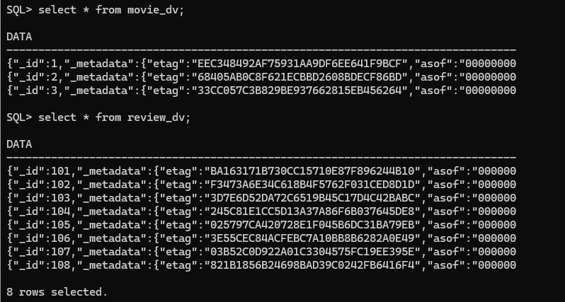 Let’s insert some data but… take a look! We are using the duality views instead of the underlying tables. This will automatically populate the movie and review tables (yep!)