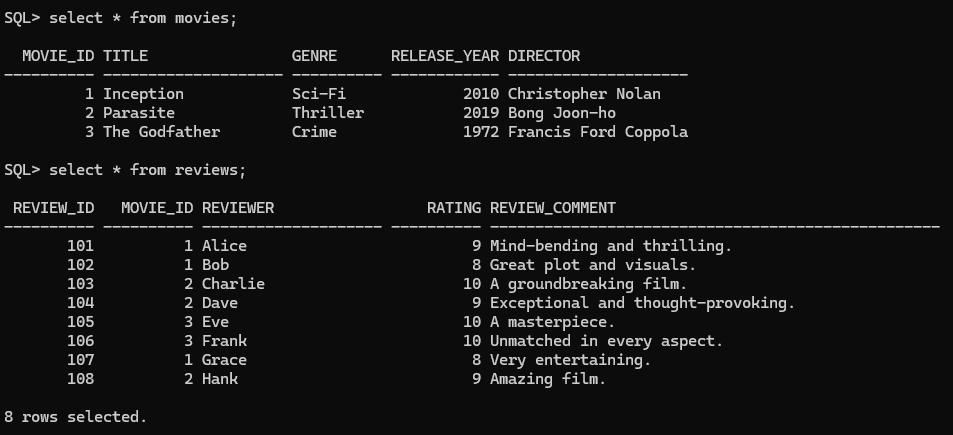 SELECT m.movie_id, m.title, m.genre, m.release_year, m.director, r.review_id, r.reviewer, r.rating, r.review_comment