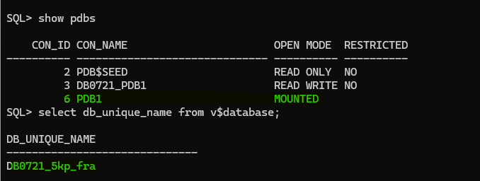 show pluggable database PDB1 AT DB0721_5kp_fra