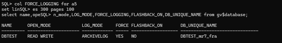 select name,open_mode,LOG_MODE,FORCE_LOGGING,FLASHBACK_ON,DB_UNIQUE_NAME from gv$database;