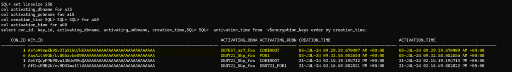 select con_id, key_id, activating_dbname, activating_pdbname, creation_time, activation_time from  v$encryption_keys order by creation_time;