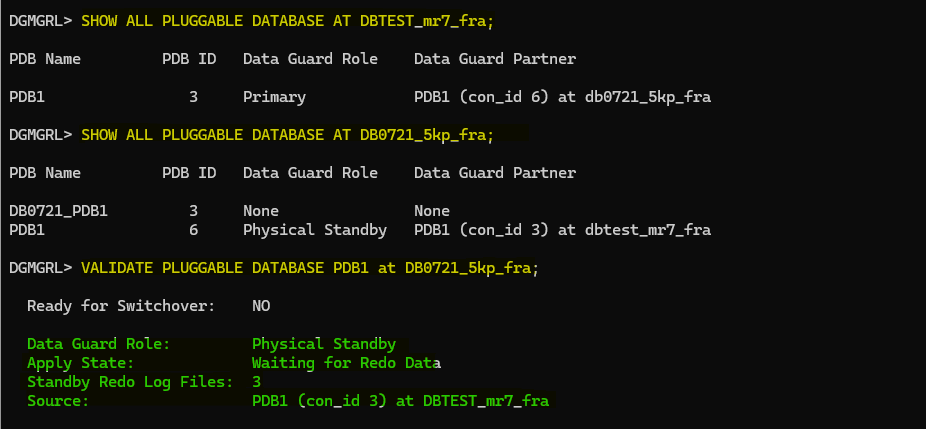 We will connect to the DG broker and perform the operation, but we need to make sure that PDB is ready for switchover, let’s take a look using the VALIDATE PLUGGABLE DATABASE command: