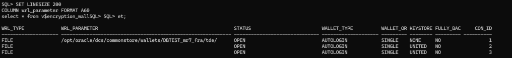 TDE is configured in my source and target CDBs. Therefore, I need to copy the wallet key for both the CDB and PDB into the target CDB/PDB for which we are setting up DG configuration. Let’s do that.
