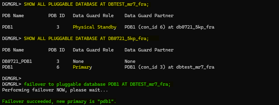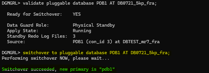 switchover to pluggable database PDB1 AT DB0721_5kp_fra;