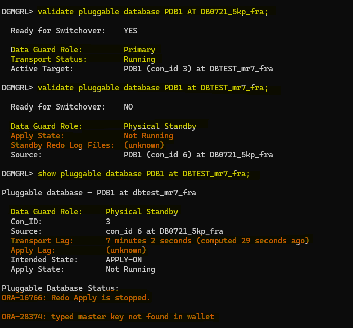 So, redo is stopped in our target PDB, and it also mentioned that we have an ora error: ORA-28374: typed master key not found in wallet