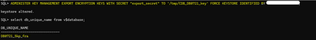 ADMINISTER KEY MANAGEMENT EXPORT ENCRYPTION KEYS WITH SECRET "****" TO '/tmp/CDB_DB0721_key' FORCE KEYSTORE IDENTIFIED BY "****";