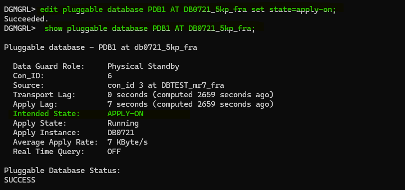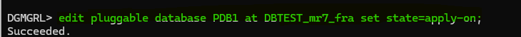 DGMGRL> edit pluggable database PDB1 at DBTEST_mr7_fra set state=apply-on;