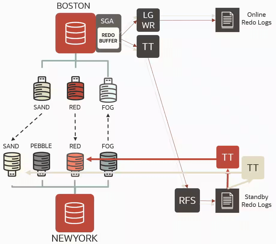 DGPDB uses the same redo transport services architecture as traditional Data Guard. In the primary instance, the log writer process (LGWR) writes the redo information of the whole CDB to the online redo logs (ORLs). The ASYNC transport process (TTnn) then sends this information to the remote CDB where the target PDBs reside. The receiver process (RFS) writes the redo received from the primary to the standby redo logs (SRLs). Up to this point, the transfer mechanism remains the same as traditional Data Guard and provides the exact gap resolution mechanism.