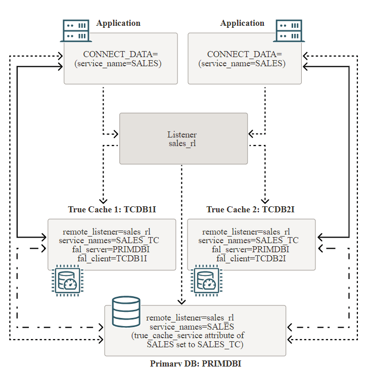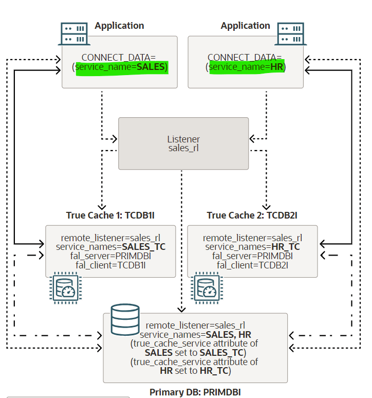 This approach allows the combined cached data size to exceed what a single primary database or uniform cache configuration can manage. In this setup, different True Caches are associated with specific database application services. For instance, one True Cache might be linked to the SALES service, while another is connected to the HR service. Applications can manage connections manually by directing queries to the appropriate True Cache service and updates to the primary database service. Alternatively, for greater transparency, primary database services can be associated with corresponding True Cache services using the TRUE_CACHE_SERVICE parameter. This configuration allows applications to switch between read and write operations seamlessly by adjusting the setReadOnly flag in the JDBC connection. Both the True Caches and the primary database share a remote listener, facilitating efficient session distribution and load balancing across the caches.