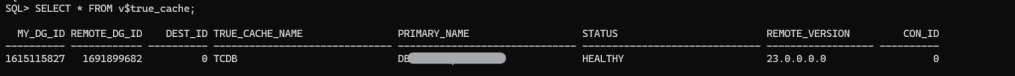 You can query the V$TRUE_CACHE view on the primary database and True Cache. On True Cache, the view displays a single row for the primary database that it connects to. On the primary database, the view shows one row for each True Cache that’s connected to the primary database. Each row displays the status for the True Cache.