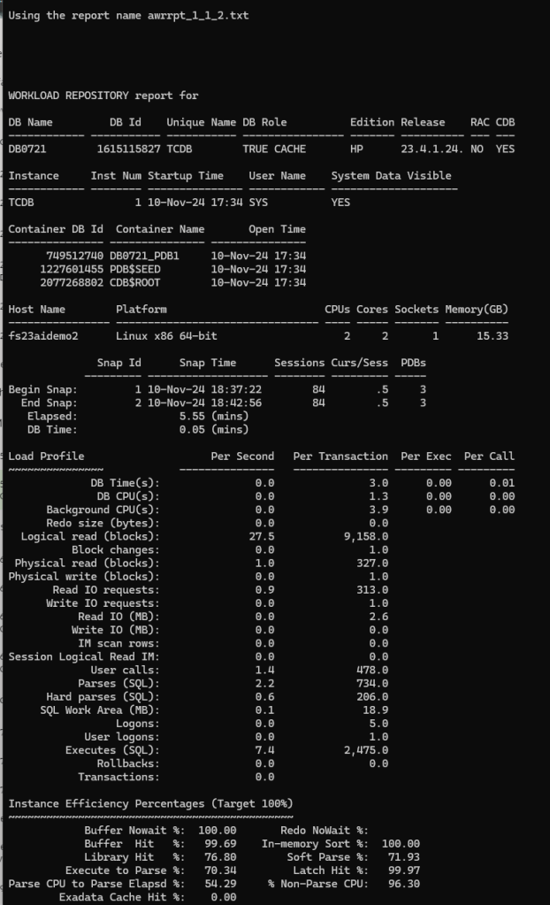 You can also use AWR to gather statistics for True Cache. AWR snapshots are enabled by default and are captured hourly. You can also create snapshots manually connected to the True Cache as follow: