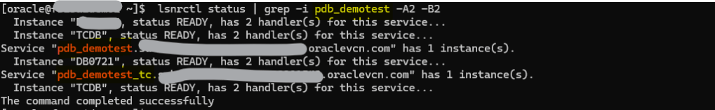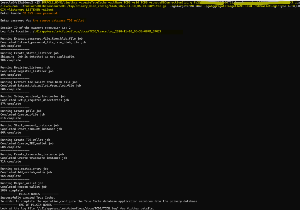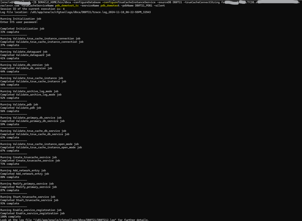 Now, I will run the dbca -configureDatabase command with the -configureTrueCacheInstanceService parameter. This configures the True Cache database application service on the primary database and then starts the True Cache service on True Cache instance.