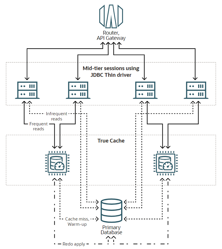 True Cache is an in-memory, read-only cache in front of an Oracle database. Like Oracle Active Data Guard, True Cache is a fully functional, read-only replica of the primary database, except that it’s mostly diskless.
