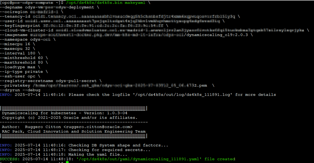 The makeyaml function generates YAML deployment files for each VM Cluster configuration. You can reuse these YAMLs for future deployments. Parameters like minECPU/, minOCPUmaxECPU/, maxOCPUminThreshold, and maxThreshold usually vary per cluster, as does the cloud-vm-cluster-id.