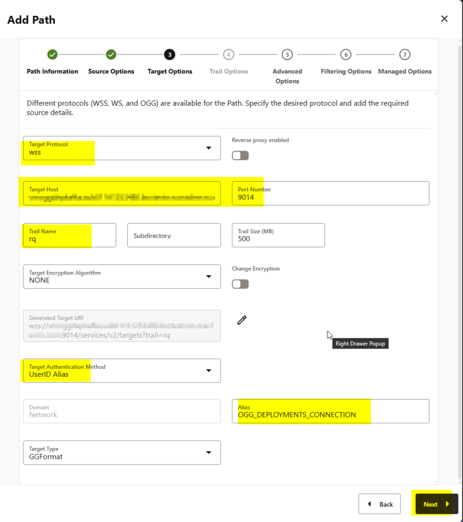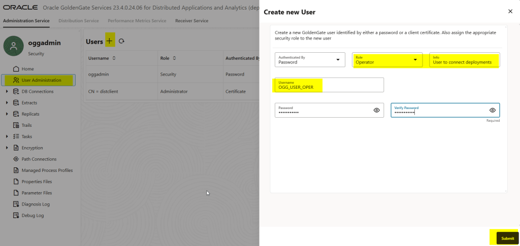 - USERIDALIAS target authentication: On the target deployment, a user with Operator role is created and then the credentials of this user are added as credentials in the source Oracle GoldenGate deployment. When using the USERIDALIAS method, while creating the Distribution Path, the value of target authentication method is set to Password. The WSS (secure web socket) protocol is used for this type of distribution path.