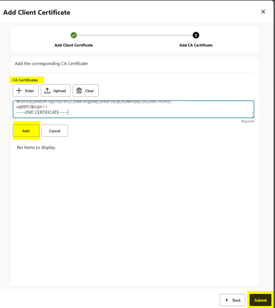 add the RootCA certificate as well and click on the ADD button before the submit: