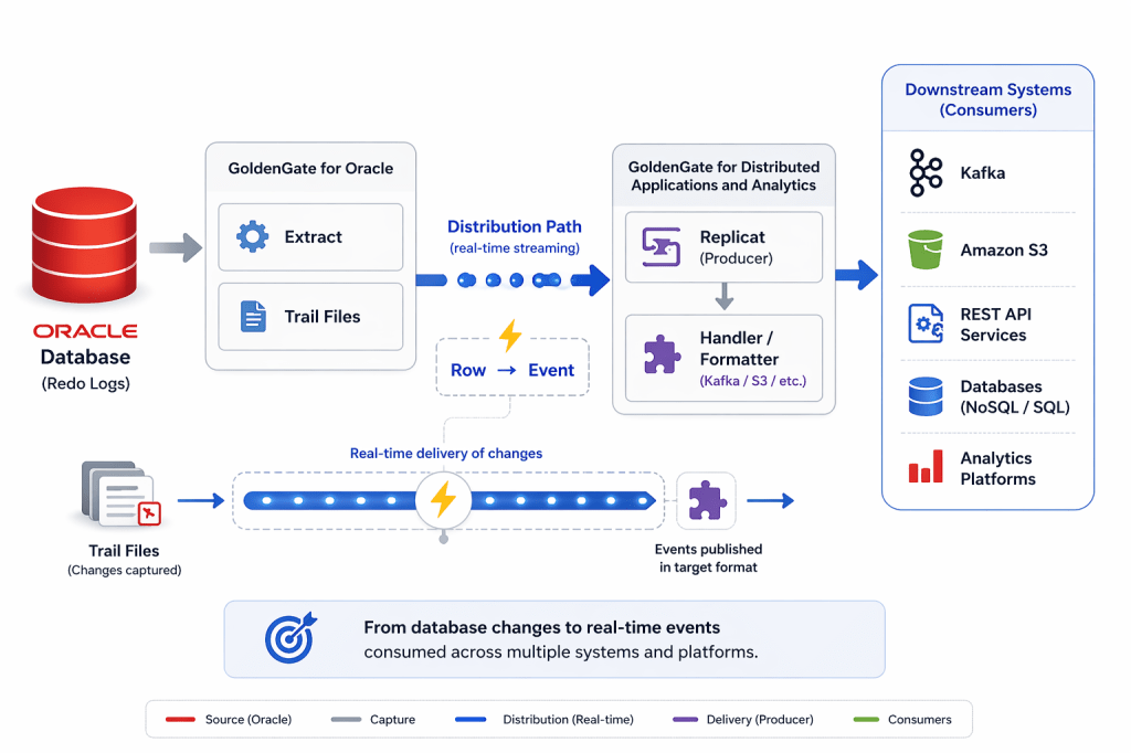GoldenGate is no longer just about moving data from one database to another. It is about turning transactions into events, and making those events available to systems that were never designed to talk directly to your database. Kafka, object storage, REST endpoints, analytics engines… all of them can become consumers of your database changes, in near real time.